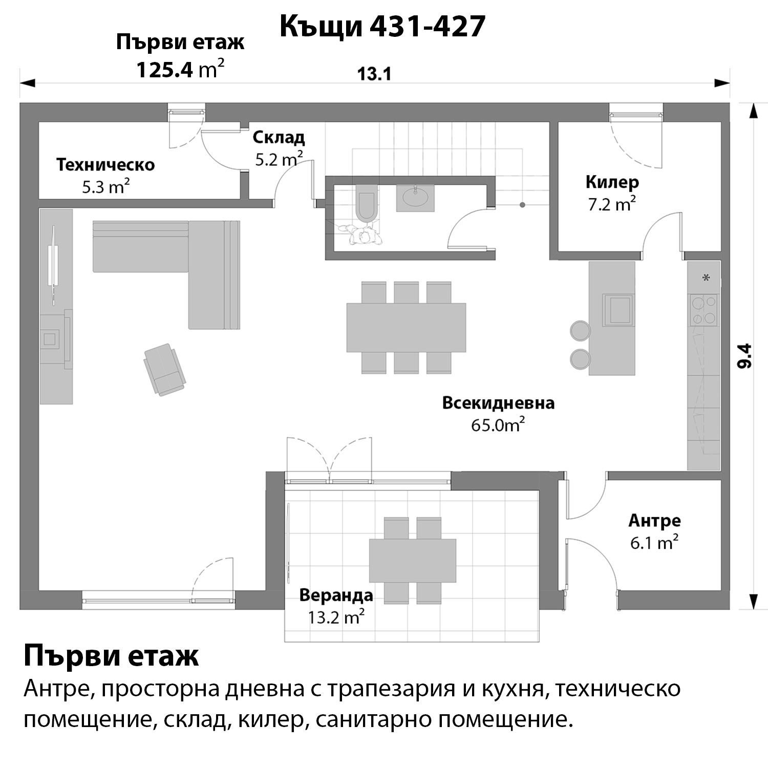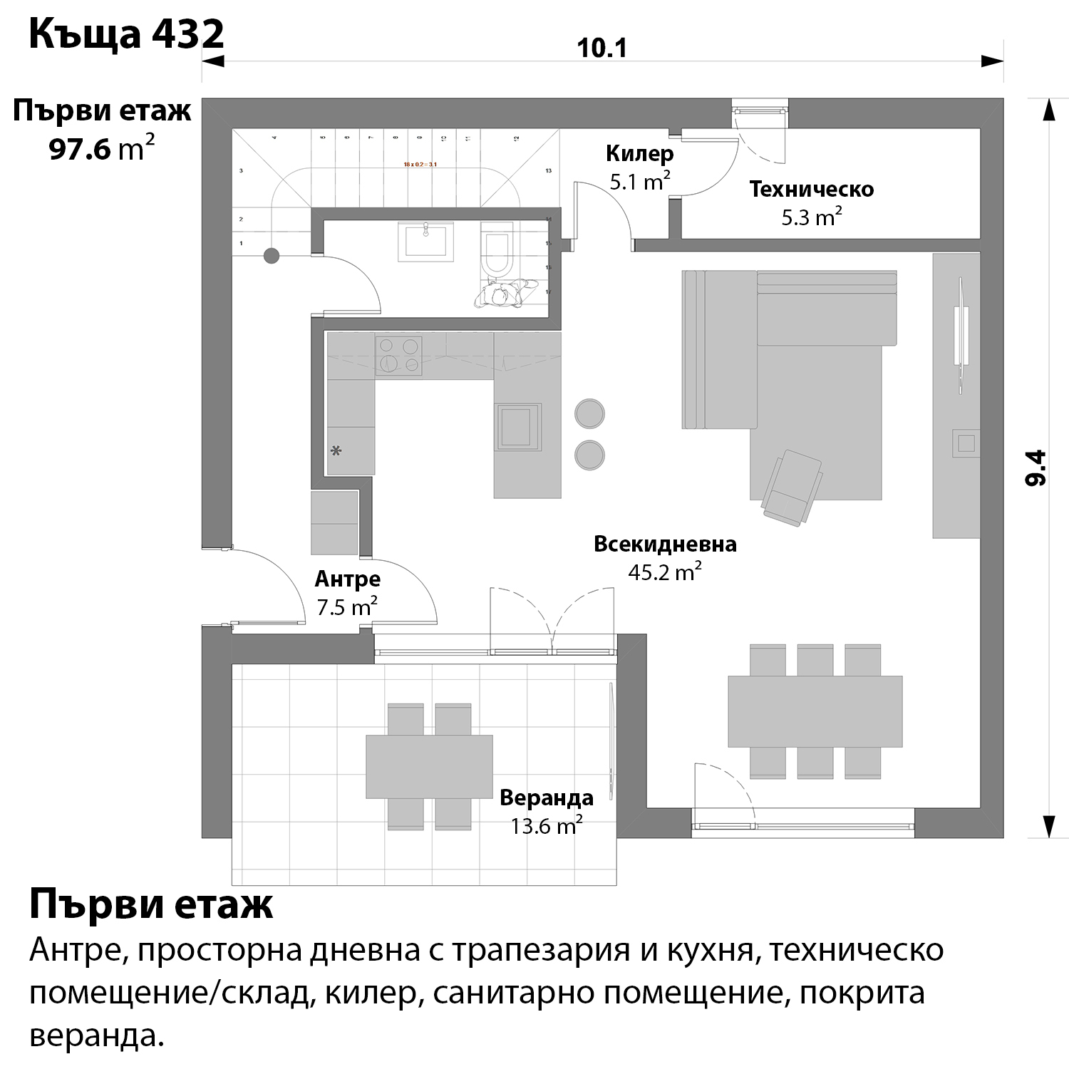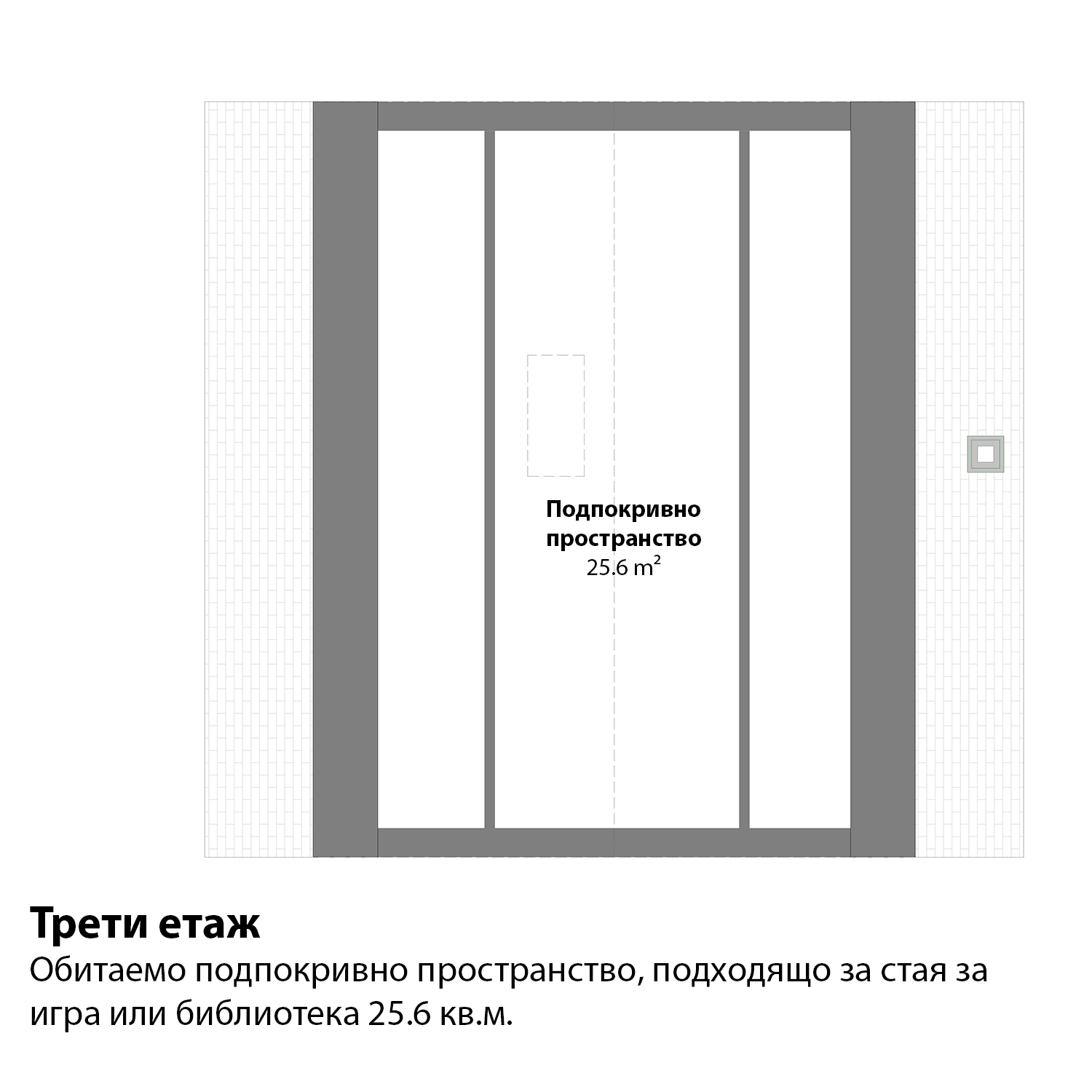 Общата площ на къща 432 е 217.9 кв.м. заедно с подпокривното пространство на третия етаж.