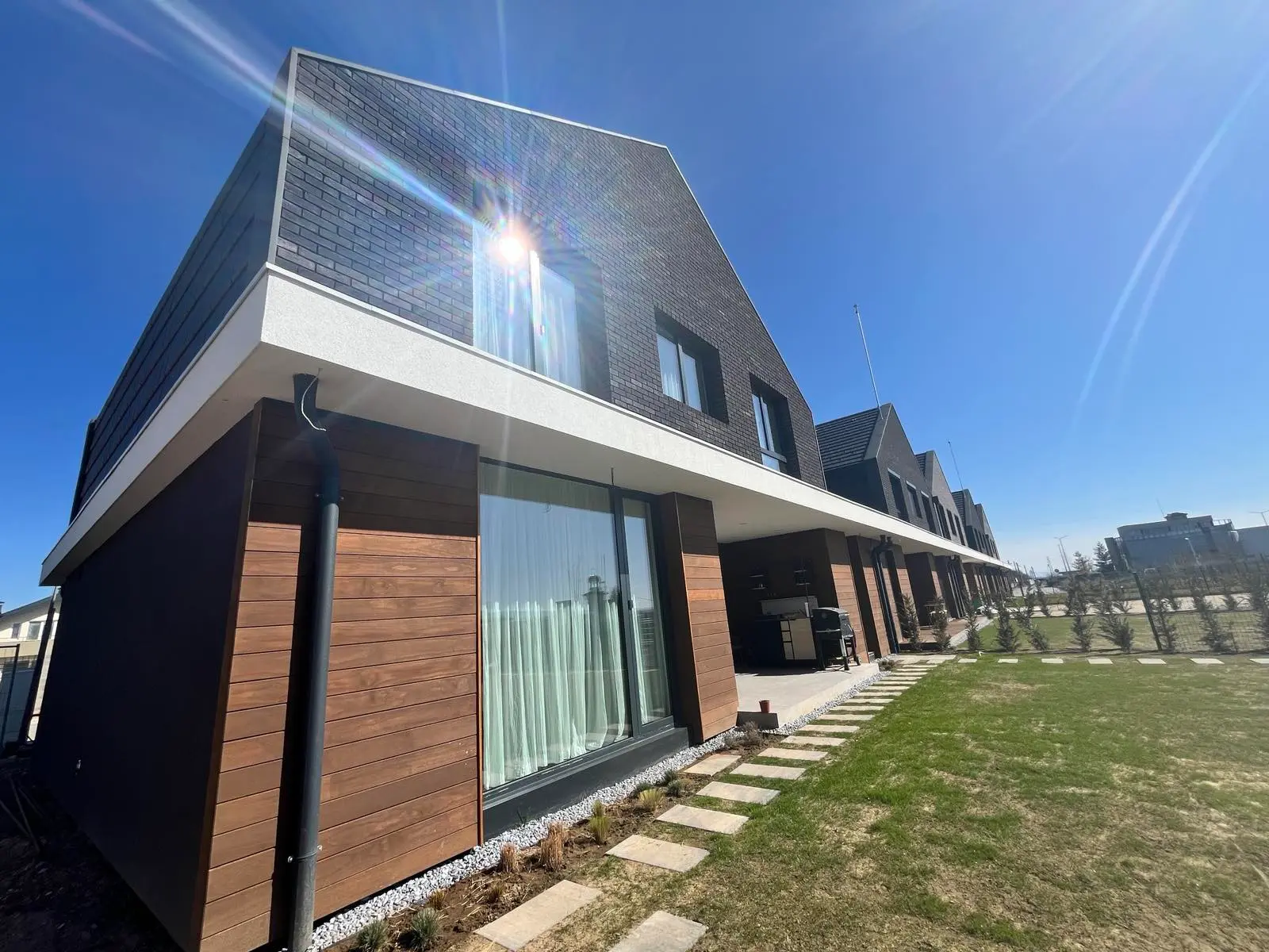 Фасадната облицовка е дръзко съчетание от естествена дървесина и белгийски керамични тухли.